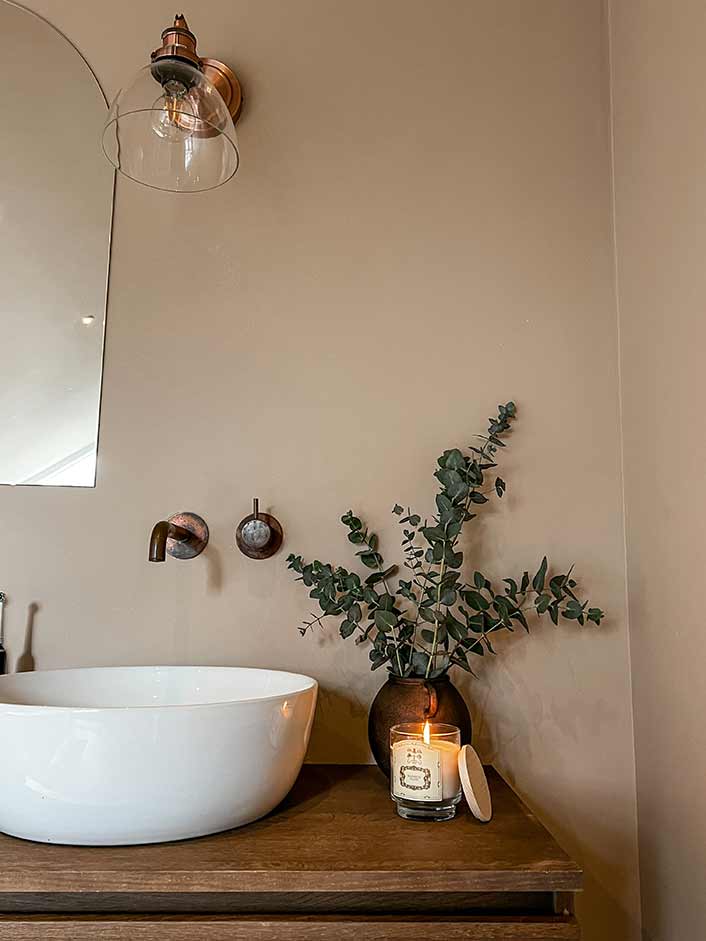 Kies een detail en laat dit op verschillende plekken terugkomen, denk aan: koper, roségoud, matzwart, wit, chroom, geborsteld nikkel, geborsteld messing of gepolijste messing. Ik heb in mijn badkamer gekozen voor geborsteld koper. De lucht, water en het gebruik hebben invloed op het uiterlijk van het materiaal. Hierdoor krijgt het een doorleefde en warme look. Heel sfeervol en natuurlijk. Ik poets het koper twee keer per jaar. Ik heb zoveel mogelijk koperen details terug laten komen, zodat deze één geheel vormen. De prullenbak en het tandborstelbekertje mogen praktisch én mooi zijn! Neem de tijd om deze spullen in jouw stijl uit te zoeken. Dit kost niet per se meer. Bij veel woonwinkels vind je hele stijlvolle prullenbakjes. Alles draagt bij aan de sfeer. Hoe fijn is het als je omringd bent met spullen die je allemaal mooi vindt!