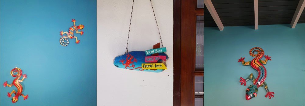 Naast kleur aan de muren zijn er vaak typische drijfhout bordjes te vinden met leuke caribische teksten of je ziet ze als naambordje bij de deur. Ook de ‘plakkie plakkie’ (Pega-pega) kan eigenlijk niet ontbreken. Deze vind je in allerlei kleuren op de verschillende markten. Zeker ook leuk om er in Nederland eentje op te hangen als aandenken!