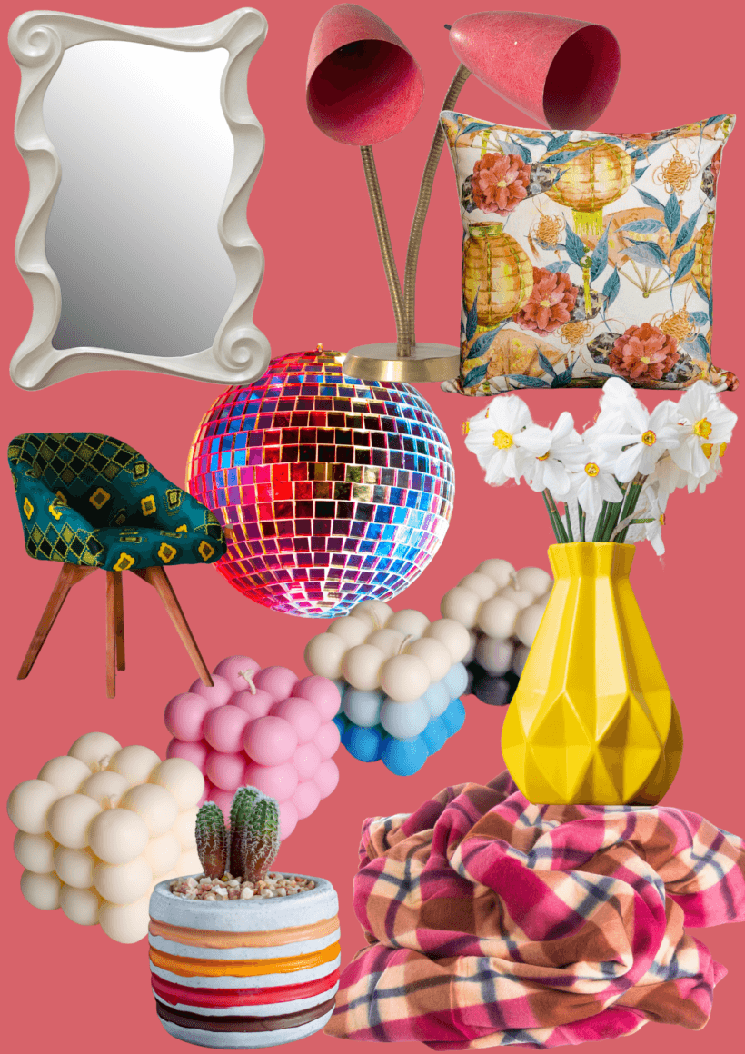 Dopamine decor is een kleurenbom, qua patronen en vormen mag eigenlijk (juist!) alles en de gekkigheid is overal aanwezig. Al met al is het nogal veel. Dat is een overeenkomst met de stijl cluttercore! Maar er zijn natuurlijk ook verschillen.
