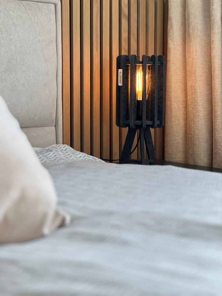 Ik hoor je denken: ‘Leuk, zo’n mooi verhaal, maar hoe ziet het er nu eigenlijk uit in huis?’. Zelf ben ik echt heel enthousiast over deze prachtige verlichting. Op de foto zie je de Lumifelt Two XL en de Lumifelt Tripod in mijn eigen slaapkamer. Oordeel zelf maar wat een knap staaltje design deze verlichting is. De grote hanglamp past perfect boven het bed. De lamp heeft de kleur zand en blend helemaal in het interieur. Het staande lampje is perfect te gebruiken als nachtlampje of als bureaulampje. Het is maar net waar je een lichtje nodig hebt.