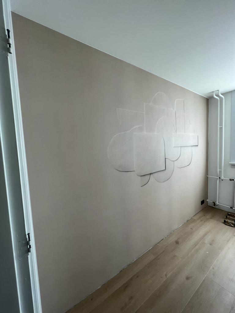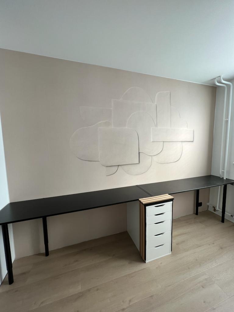 Nadat ik alle benodigdheden in huis had, ben ik samen met mijn vader aan de slag gegaan om het bureau in elkaar te zetten. We zaagden de tafelbladen op maat en zorgden voor gaten waar de verwarmingsbuizen doorheen konden lopen. Zo lijkt het bureau volledig ingebouwd tussen de twee muren.