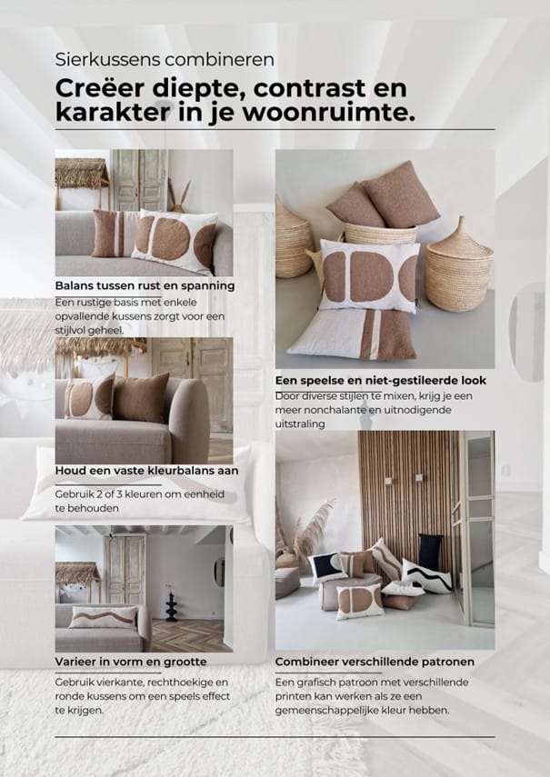 Als je alleen effen kussens in dezelfde stijl gebruikt, kan je interieur vlak en saai ogen. Door verschillende patronen, texturen en vormen te combineren, ontstaat er een gelaagd effect dat de ruimte levendiger maakt. Het combineren van verschillende stijlen sierkussens maakt je interieur interessanter, levendiger en persoonlijker. Door slim om te gaan met kleuren, materialen en patronen, creëer je een stijlvolle en harmonieuze sfeer zonder dat het te druk wordt. Wil je experimenteren met stijlen? Probeer een mix van oud en nieuw, zacht en hard, of druk en rustig en ontdek wat het beste bij jouw interieur past!