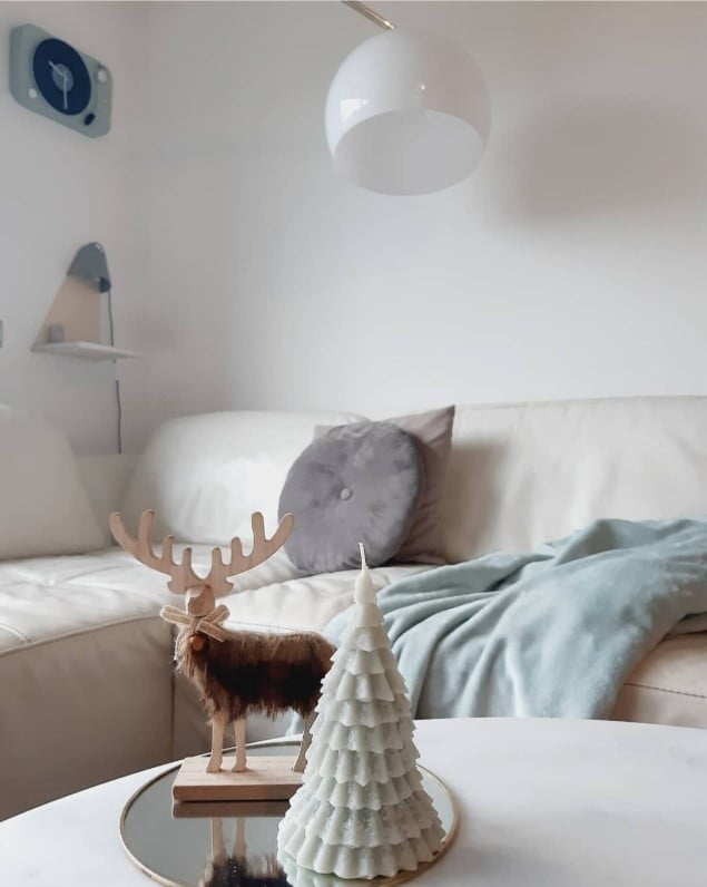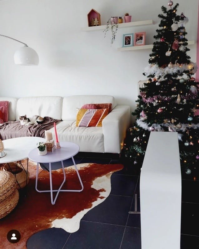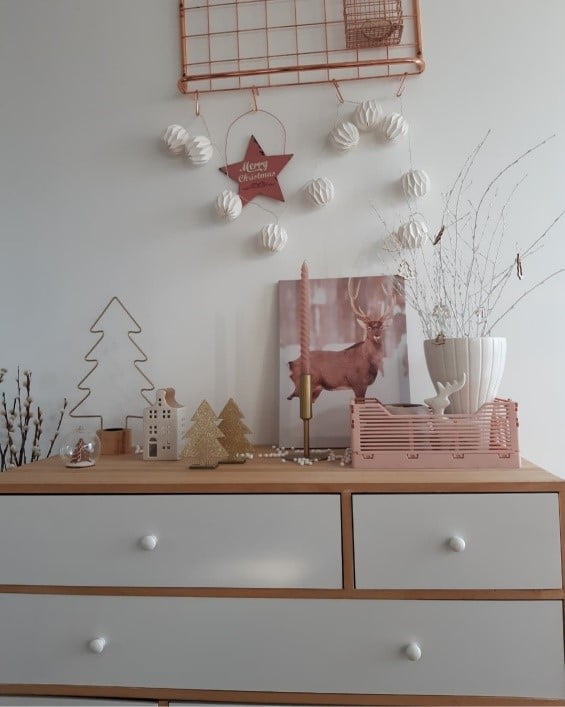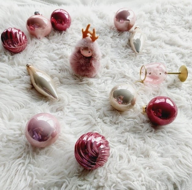 Ik hou van strak wit in combi met Scandinavische warmte en pasteltinten. Al jarenlang hangen er dezelfde kerstballen in pastelkleuren in mijn boom. Jaarlijks koop ik wel wat nieuwe elementen om erbij te hangen. Dit jaar waag ik het erop enkele nieuwe kleuren toe te voegen, ik kocht enkele felroze en kobaltblauwe pareltjes in de kringwinkel.