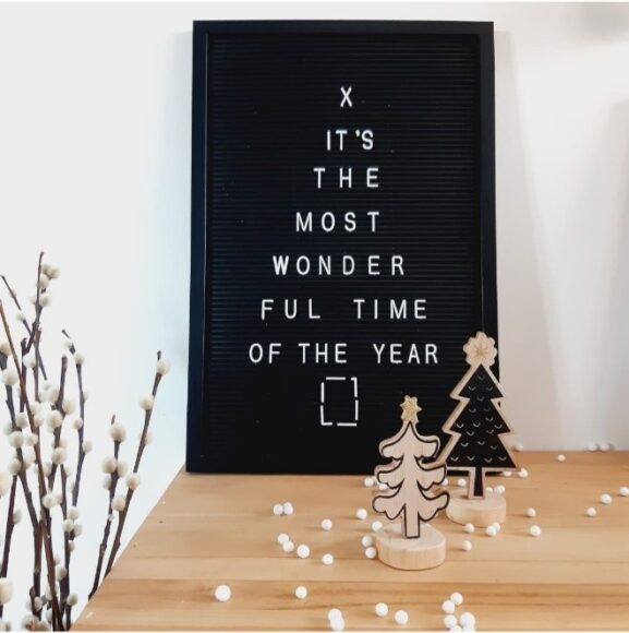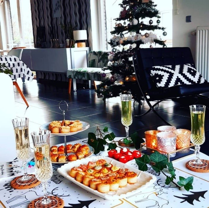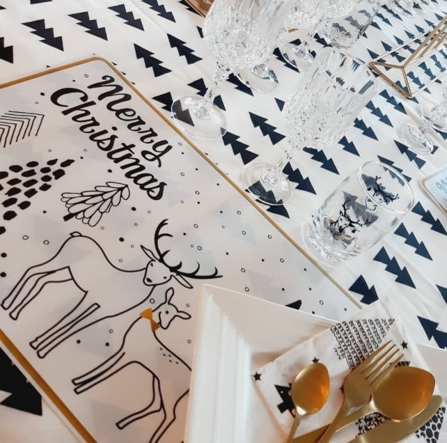 Mijn kersttafelkleed is wit met een zwart kerstboommotiefje, de borden rechthoekig en wit, het bestek goudkleurig (en budgetvriendelijk van Action). Kleur en variatie breng ik via de servetten en wat tafeldecoratie. De basis is elk jaar hetzelfde, de versiering is actueel.