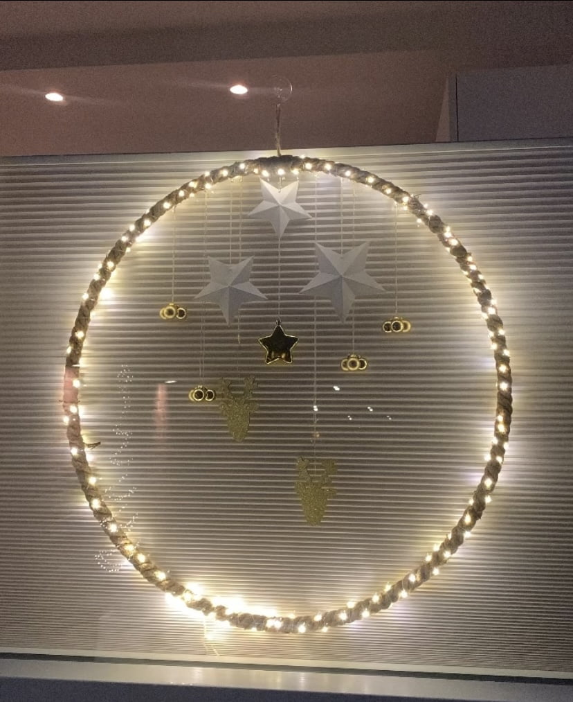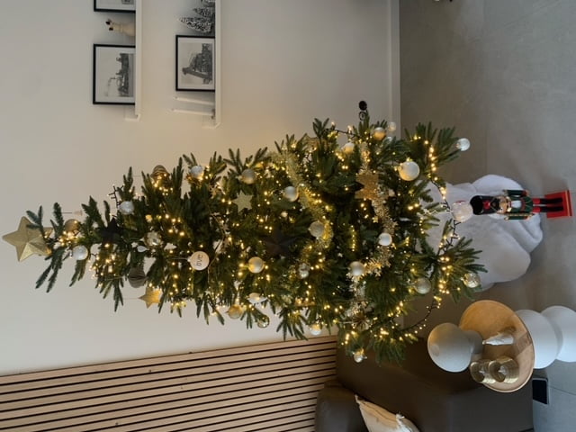 Hier heb ik lampjes omheen gedraaid en vervolgens witte sterren, gouden kersthangers en kerstballetjes erin gehangen. Heel simpel maar juist daardoor zo leuk.