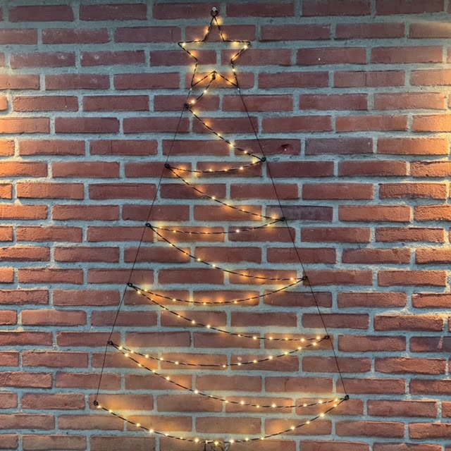 Buiten is ook de kerstsfeer aangebracht door verlichting in de vorm van een kerstboom aan de muur en een groene krans met lampjes en kerstversiering naast de voordeur. En voor buiten is het ideaal dat de meeste lampjes tegenwoordig een timerfunctie hebben. Zo gaan ze vanzelf aan en uit.