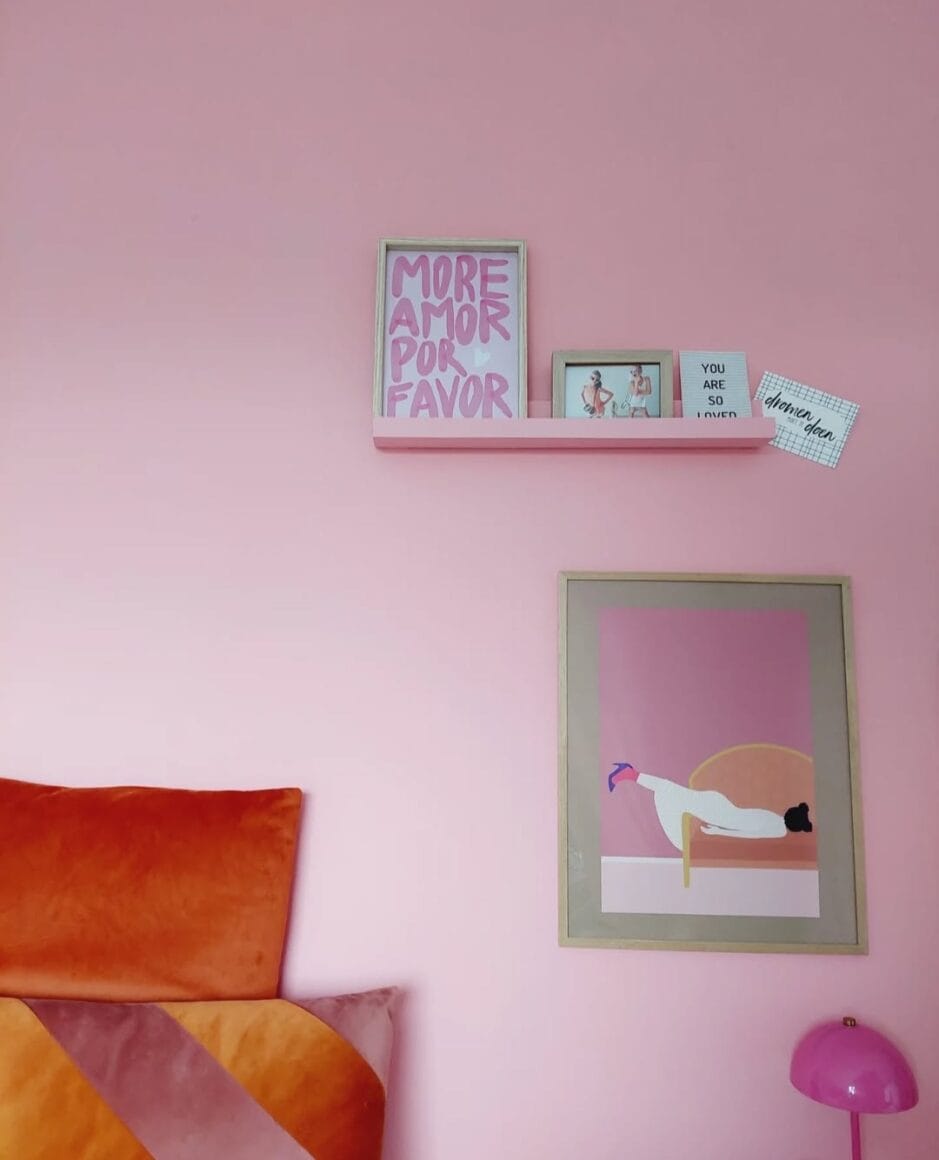 Ikzelf heb een roze slaapkamermuur maar koos wel bewust voor de muur achter het bed. Deze muur kan je leuk in thema stijlen met een muurplank. Een lief kaartje, een romantische foto, een leuke poster, …
