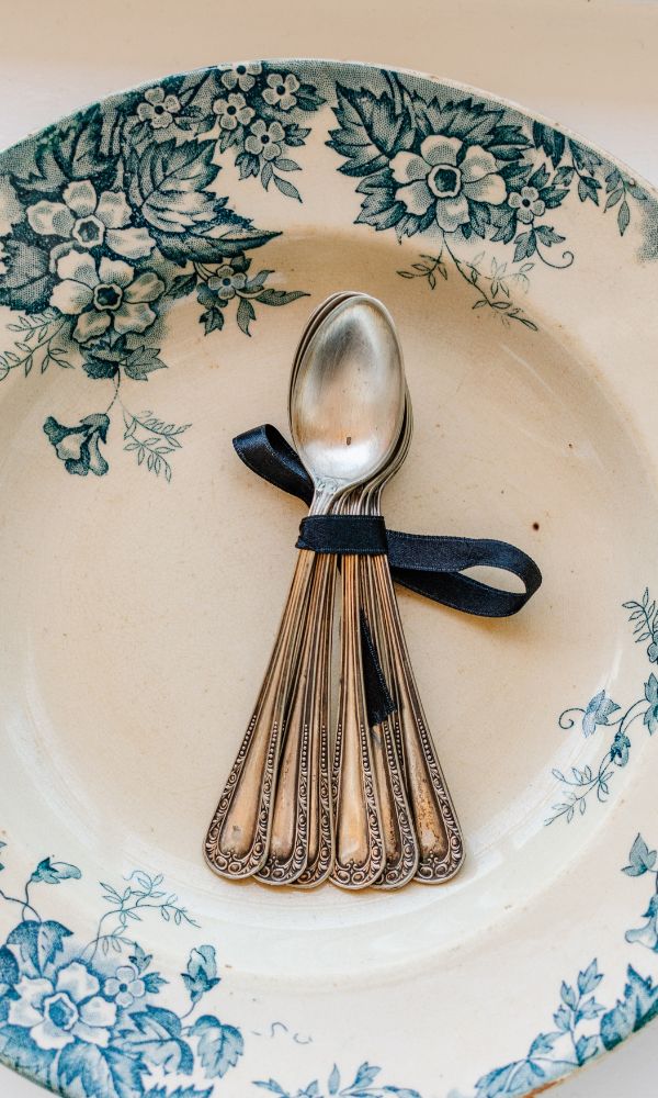 Vintage borden zijn niet alleen geschikt om het lekkerste vlees of gegrilde groenten op te serveren. Maar iedere liefhebber van vintage (zilver) bestek wil maar al te graag zijn of haar collectie op deze unieke borden willen tentoonstellen. Ze komen in de meest prachtige kleuren en dessins. Maak het extra feestelijk door een lint in dezelfde kleur als het bord om de messen, vorken of lepels te binden.