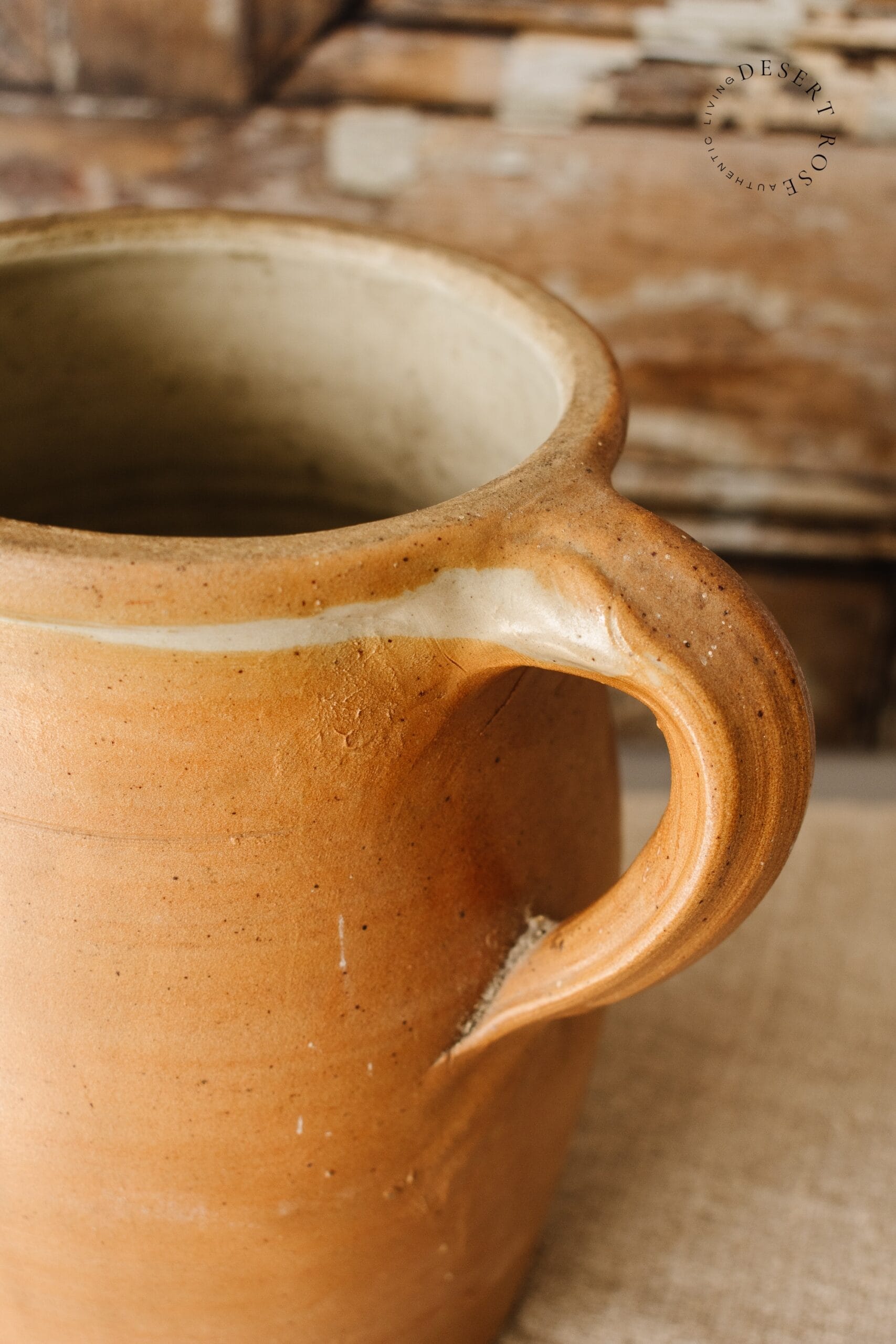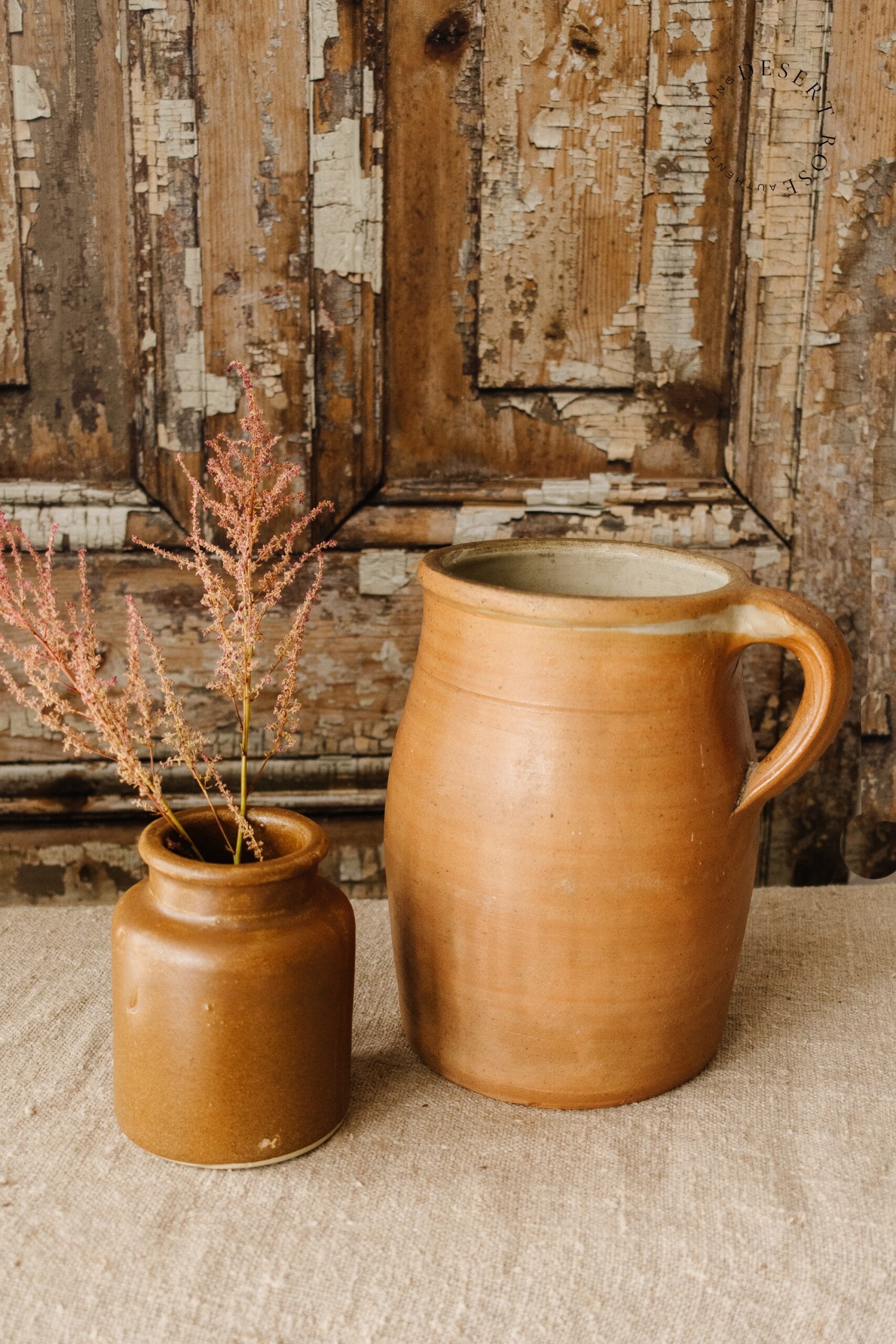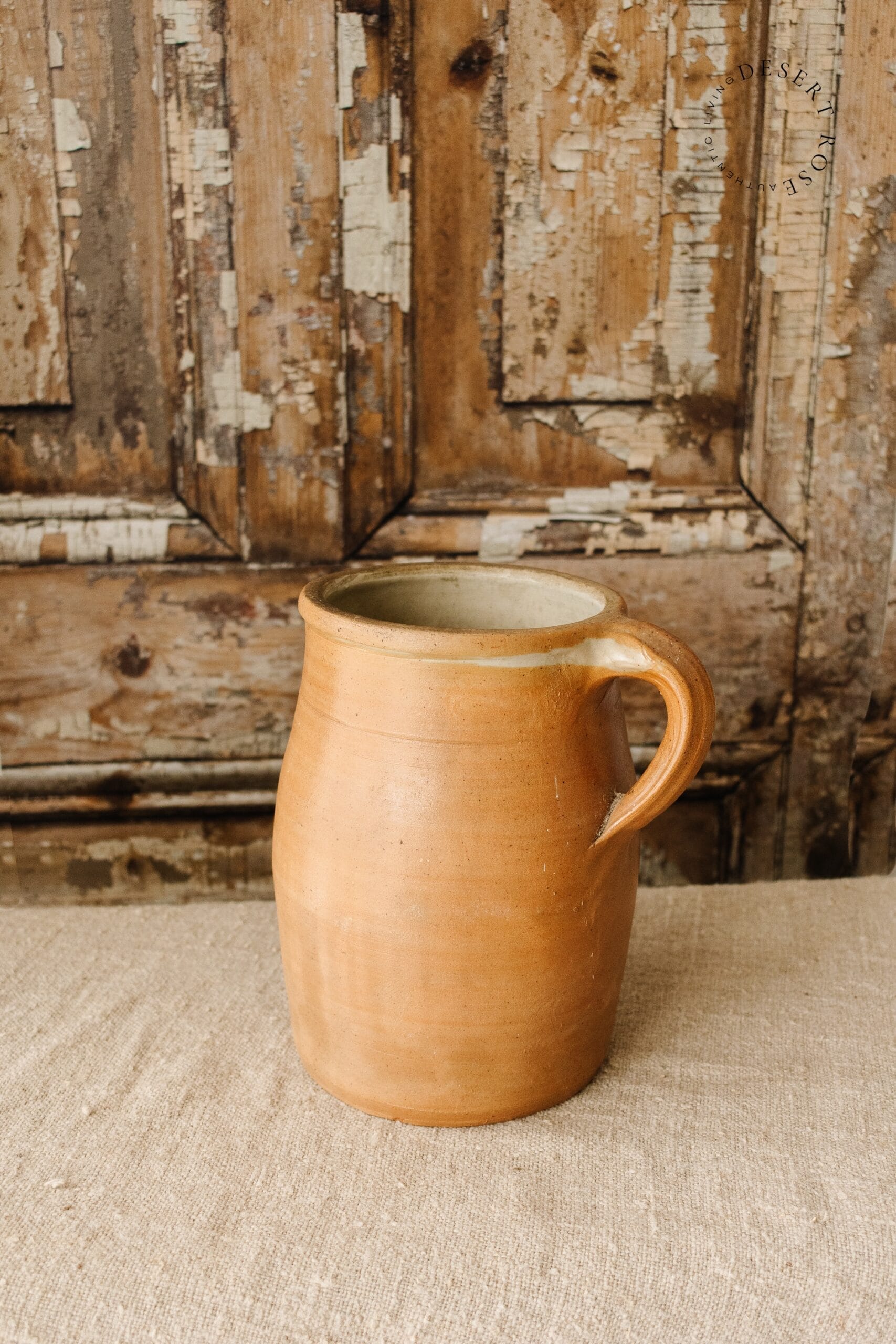 Antiek Franse greskan in een warme terra kleur. Ideaal om je keukengerei op te bergen of te gebruiken als een mooie aparte vaas. Grespotten zijn handgemaakt en hierdoor is ieder stuk uniek.