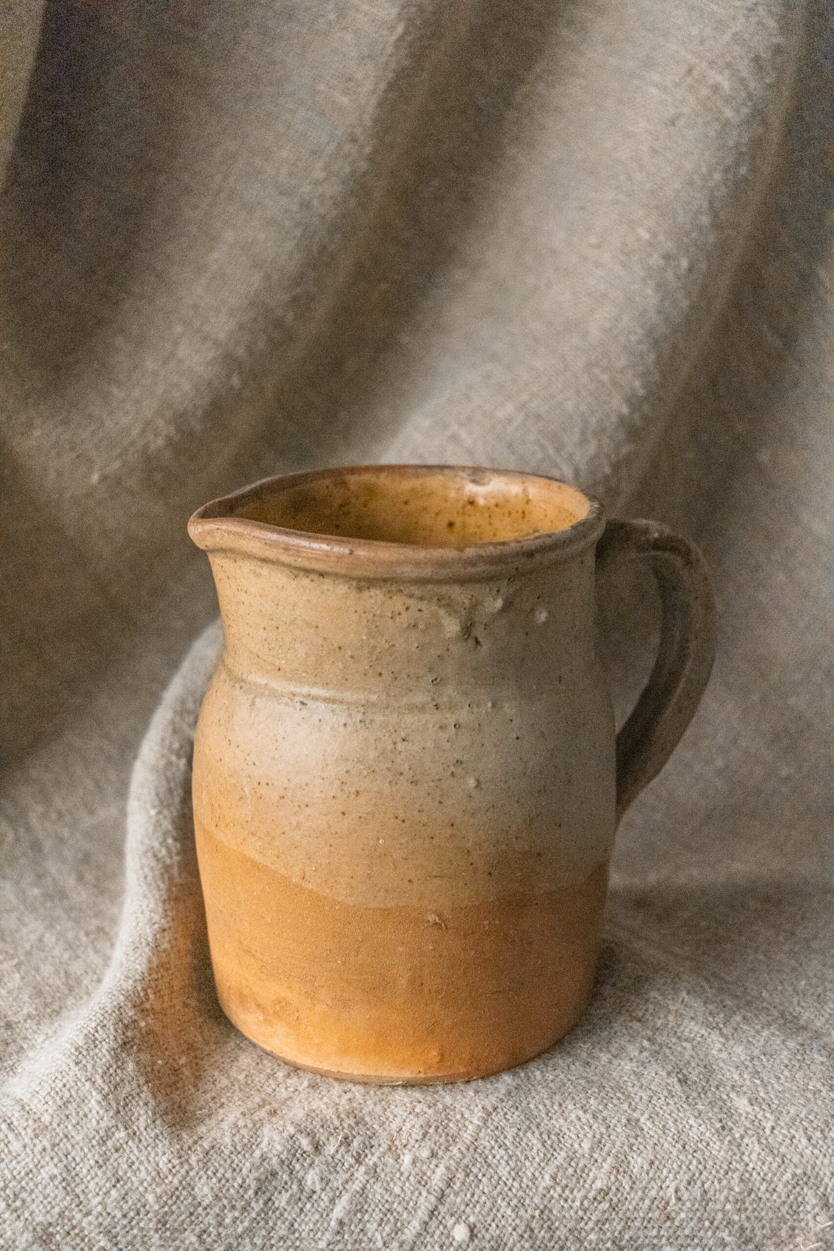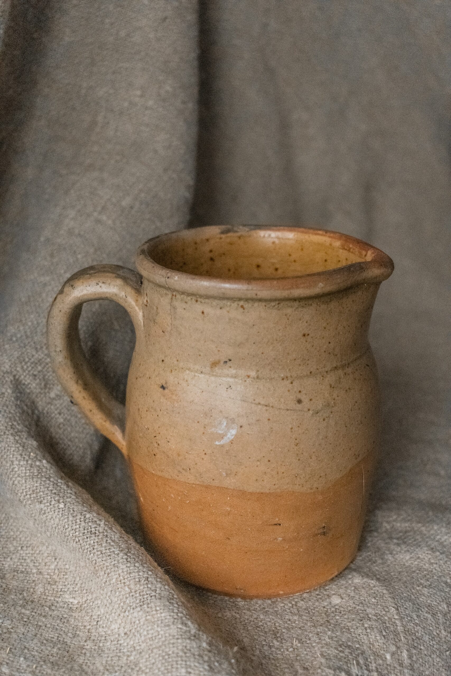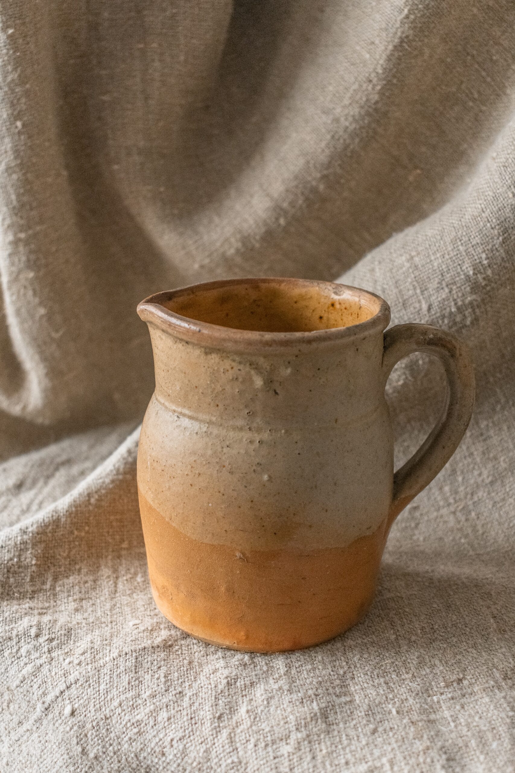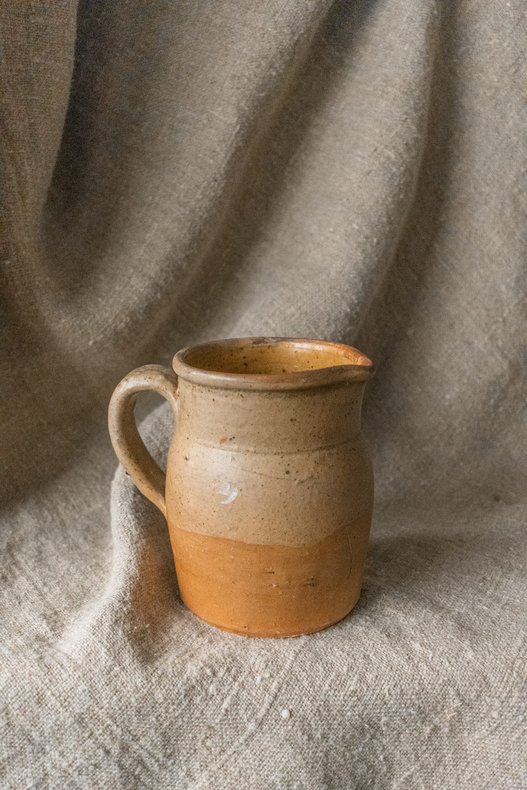 Dit Franse wijnkannetje is met de hand gemaakt in Frankrijk van hoogwaardig steengoed. Het heeft een geglazuurde binnen- en buitenkant.